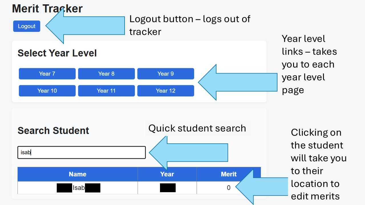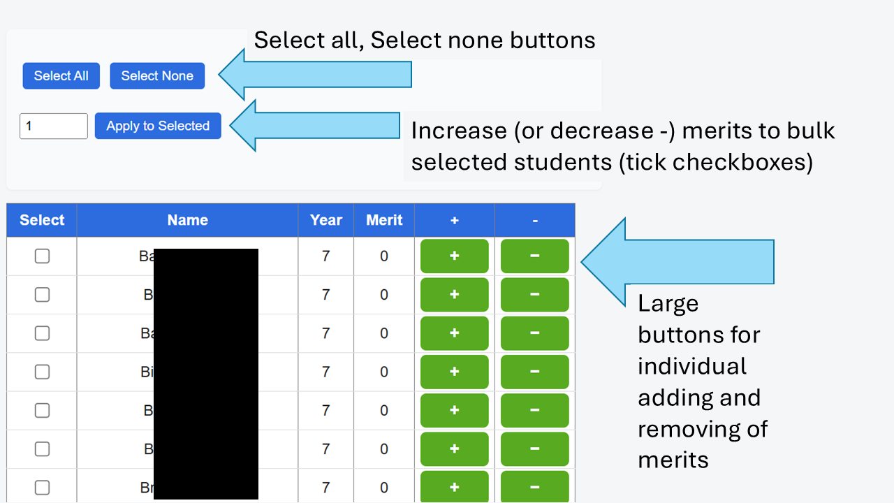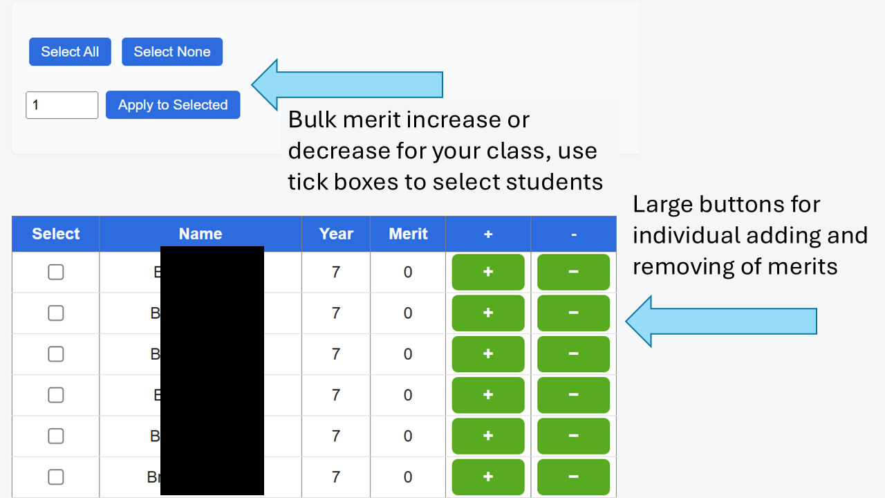 Here, you get a complete list of students, allowing you to add or remove merit points