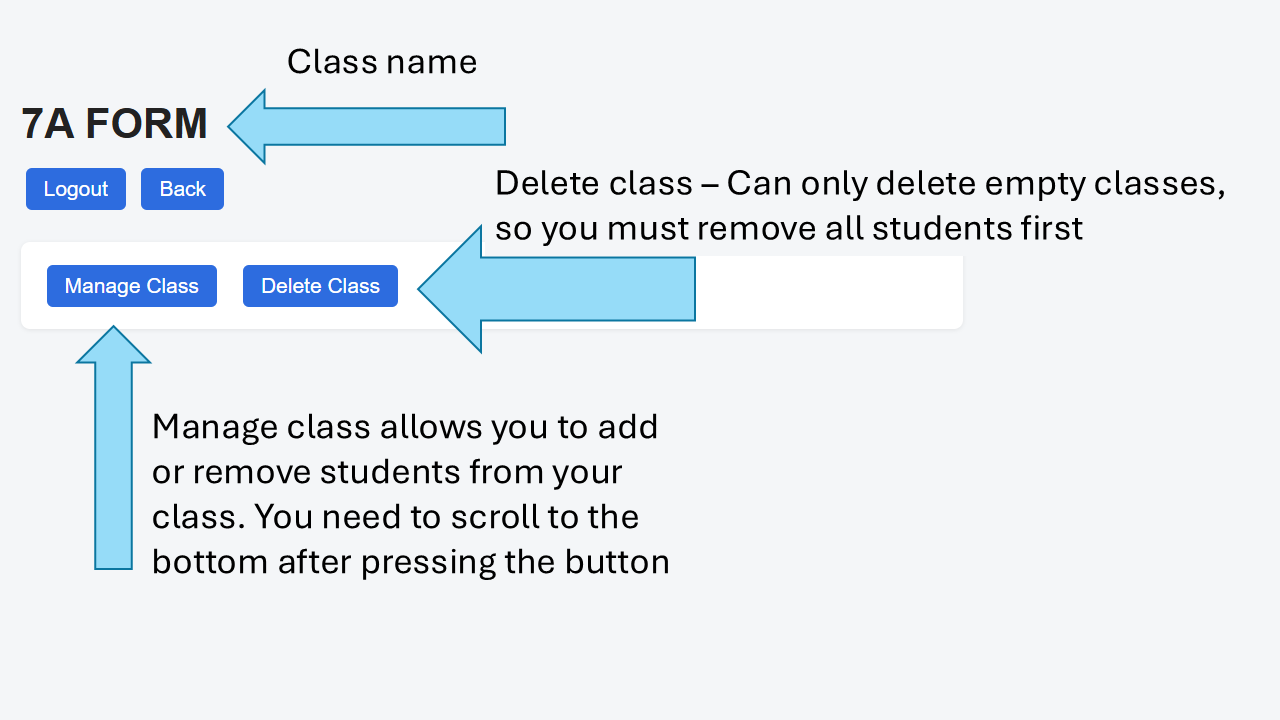 If you need to add or remove students, click "manage class", tick or untick student names, "save changes" and it updates automatically. You aren't deleting students from the system, just your class